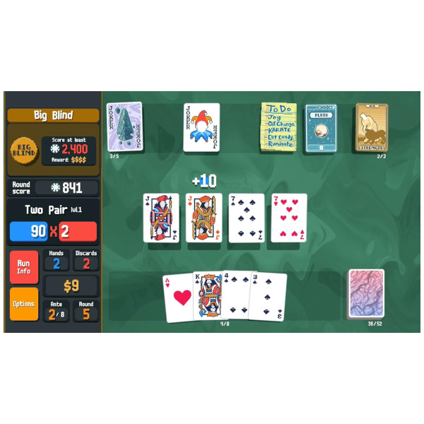 Combine valid poker hands with unique joker cards in order to create varied synergies and builds. Earn enough chips to beat devious blinds, all while uncovering hidden bonus hands and decks as you progress.